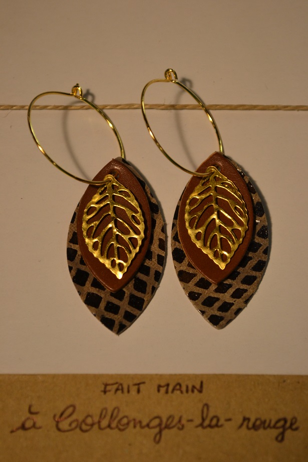 Deux feuilles en cuir et une feuille en métal doré ajouré, créoles en acier doré